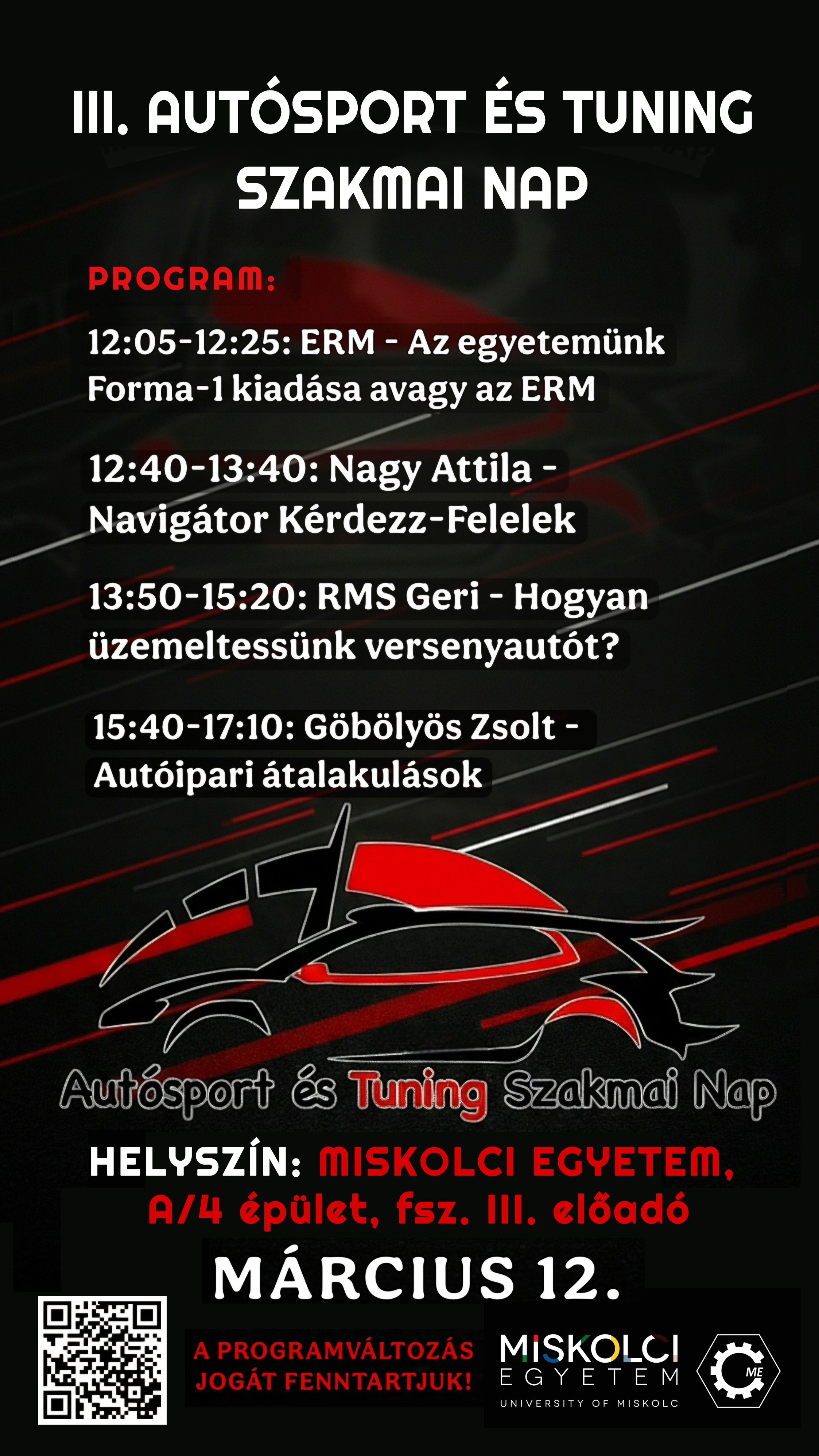 A Miskolci Egyetem Terplán Zénó Szakkollégium Járműmérnöki Tervezés és Technológiák Szakosztálya szeretettel vár minden érdeklődőt a III. Autósport és Tuning Szakmai Napra.